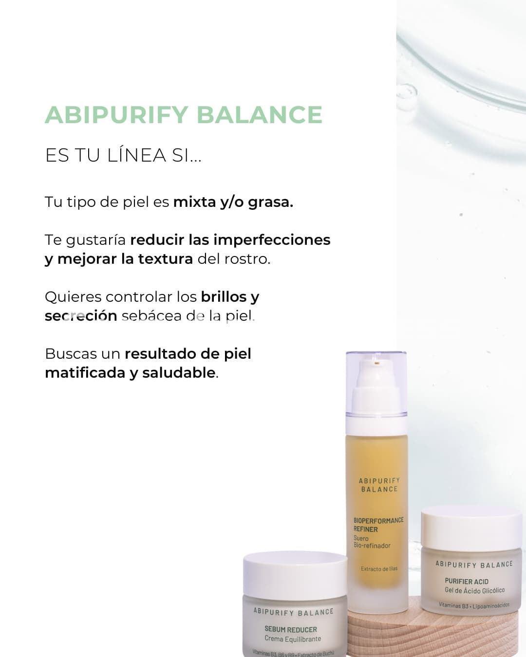 El Bioperformance Refiner de la línea Abipurify Balance de Abidis es un sérum facial diseñado para tratar pieles mixtas y grasas con tendencia a imperfecciones. Su fórmula avanzada regula la producción de sebo, controla la proliferación microbiana y atenúa las imperfecciones inflamatorias. Gracias a su textura ligera y rápida absorción, es ideal para uso diario y como complemento a la crema equilibrante de la misma línea.